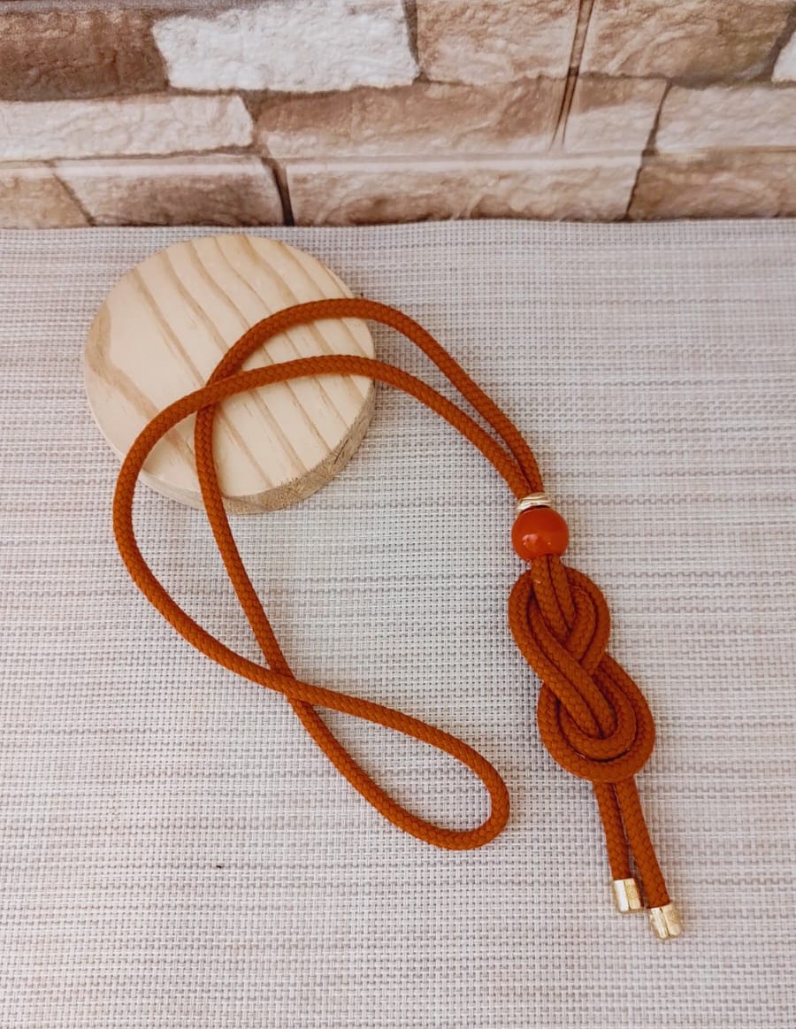 O colar apresenta corda na tonalidade terracota com detalhes em metal dourado que proporcionam um acabamento sofisticado e moderno. O pingente em resina, acompanhado por um nó decorativo, adiciona um toque artesanal ao acessório, tornando-o perfeito para looks casuais e ocasiões especiais.